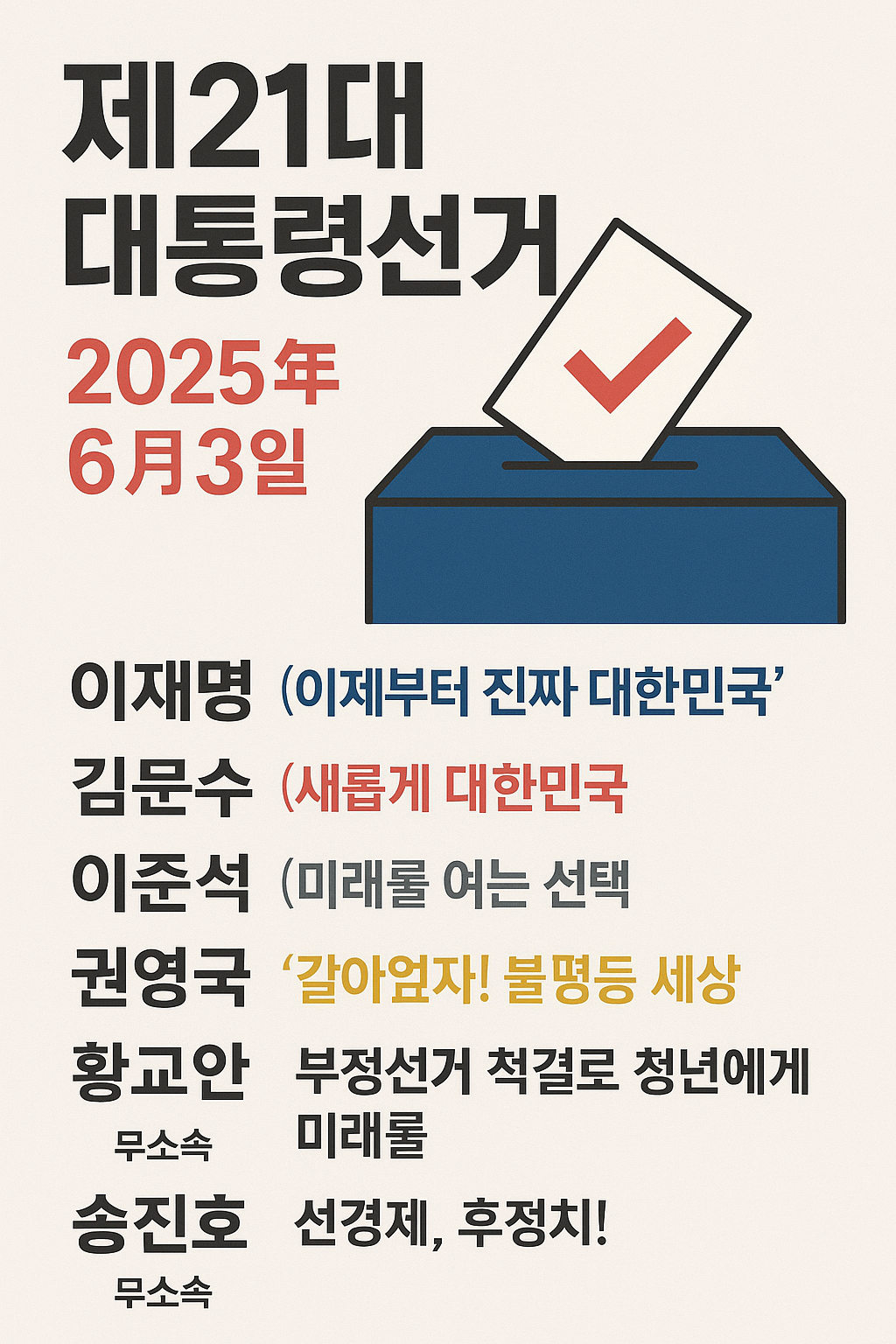 김문수 (국민의힘): 전 고용노동부 장관으로, "새롭게 대한민국"을 슬로건으로 출마